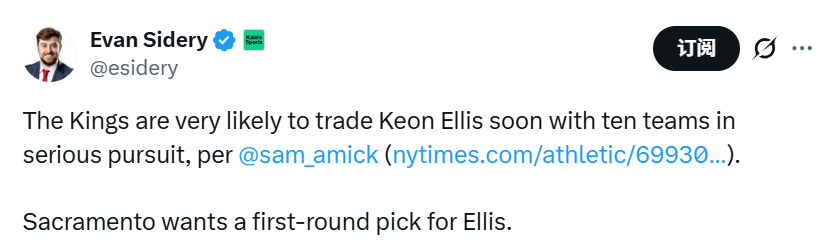 尽管埃利斯拥有备受青睐的“3D”属性,国王队主帅克里斯蒂却在过去两场比赛中弃用了他。消息人士称,国王队希望通过这笔交易得到一个首轮末段的选秀签。
