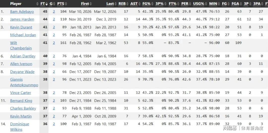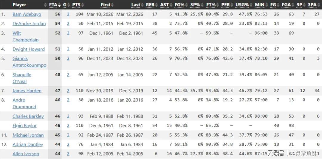 其中有两项纪录跟罚球那是“纠缠不清”。其一呢,阿德巴约两场比赛加起来,罚球次数高达56次,直接把小乔丹从“罚球纪录宝座”上给拽了下来,自己美滋滋地坐了上去,成了NBA历史新晋“罚球王”。其二更猛,两场比赛靠罚球就拿了45分,把哈登都给比下去了,这罚球得分能力,简直比印钞机还猛!
